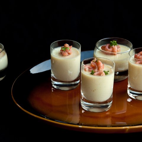 Glaasje van bloemkoolmousse met garnalen en tomaat